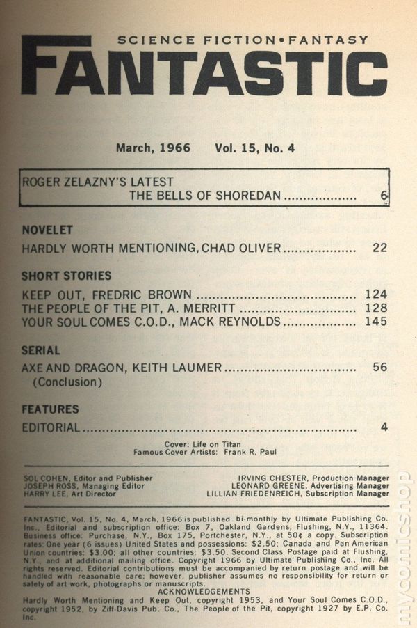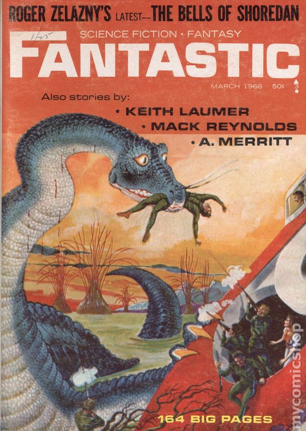 Volume 15, Issue 4 - March, 1966. Features "The Bells of Shoredan" by Roger Zelazny, and stories by Keith Laumer, Mack Reynolds, and A. Merritt. 5.5-in. x 7.75-in.; black and white; 162 newsprint pages. Cover price $0.50.