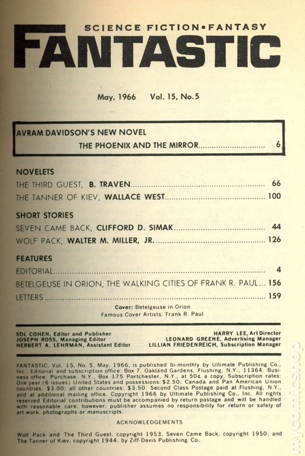 Volume 15, Issue 5 - May, 1966. Features "The Phoenix and teh Mirror" by Avram Davidson, plus stories by Clifford D. Simak, Wallace West, B. Traven, and Walter M. Miller Jr. 5.5-in. x 7.75-in.; black and white; 162 newsprint pages. Cover price $0.50.