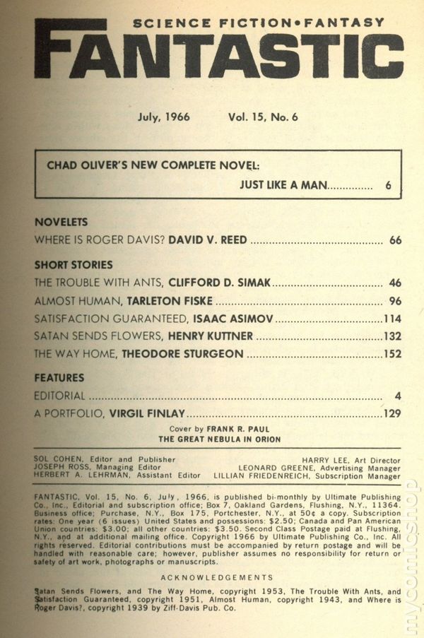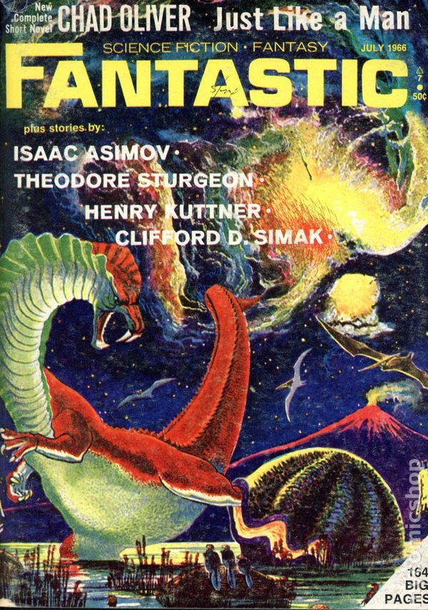 Volume 15, Issue 6 - July, 1966. Features "Just Like a Man" by Chad Oliver, plus stoires by Isaac Asimov, Theodore Sturgeon, Henry Kuttner, and Clifford D. Simak. 5.5-in. x 7.75-in.; black and white; 162 newsprint pages. Cover price $0.50.