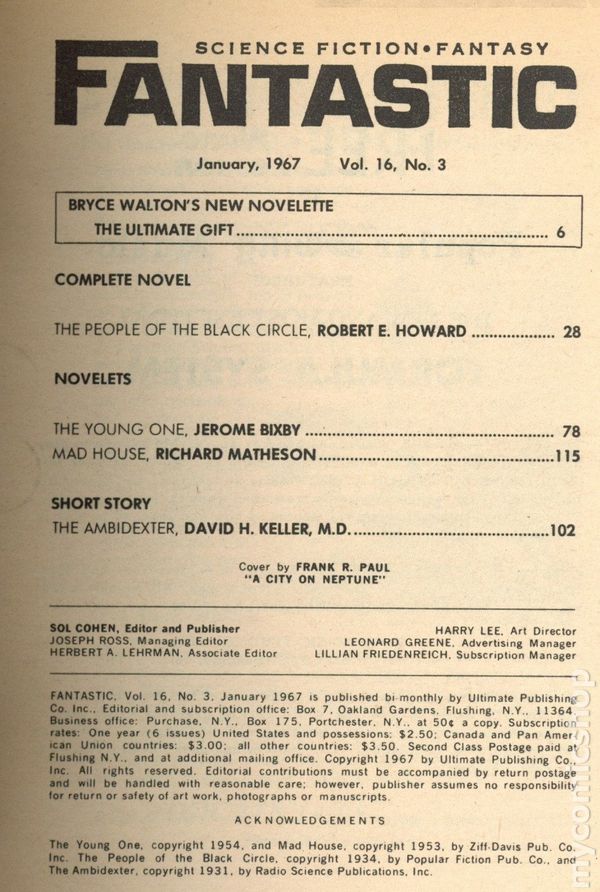 Volume 16, Issue 3 - January, 1967. Features "The Ultimate Gift" by Bryce Walton, "The People of the Black Circle" by Robert E. Howard, and stories by Richard Matheson, Jerome Bixby, and David H. Keller, M.D. 5.5-in. x 7.75-in.; black and white; 162 newsprint pages. Cover price $0.50.