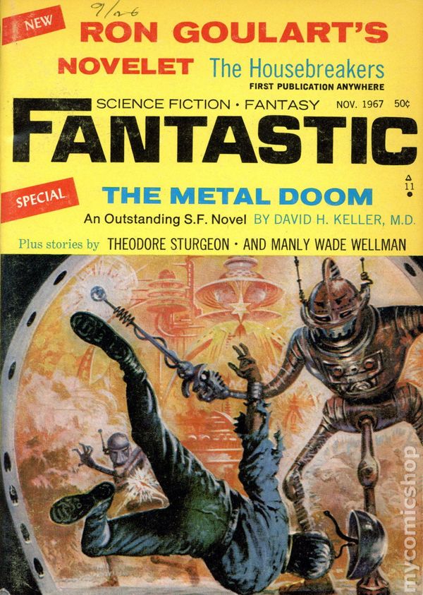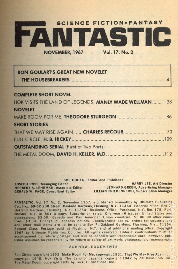 November 1967. Science Fiction and Fantasy Stories: "Hok Visits The Land of Legends" by Manly Wade Wellman, "Make Room For Me" by Theodore Sturgeon, "That We May Rise Again" by Charles Recour, "Full Circle" by H.B. Hickey, and "The Metal Doom" (Part 1 of 2) by David H. Keller, M.D. Softcover Pulp Digest, 5 1/2-in x 8-in, 162 Pages, B&W. Cover price $0.50.