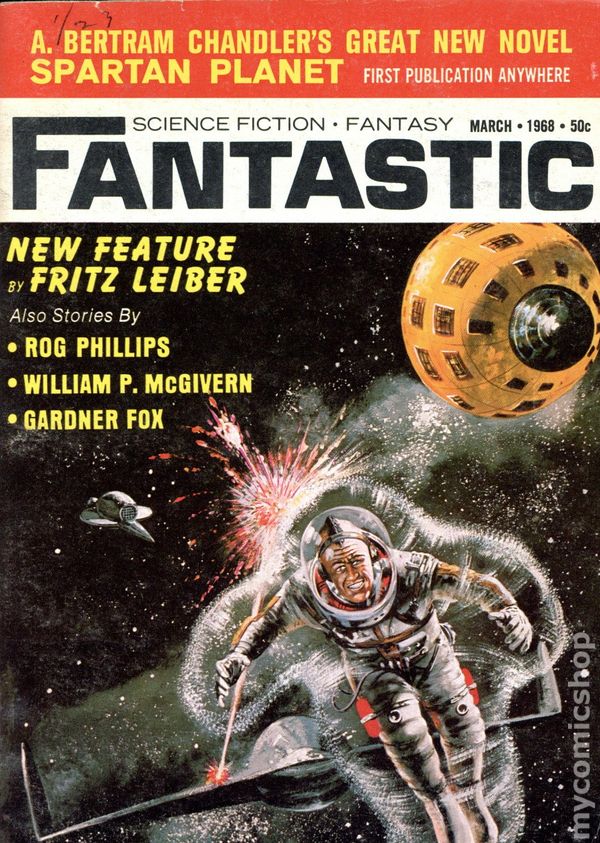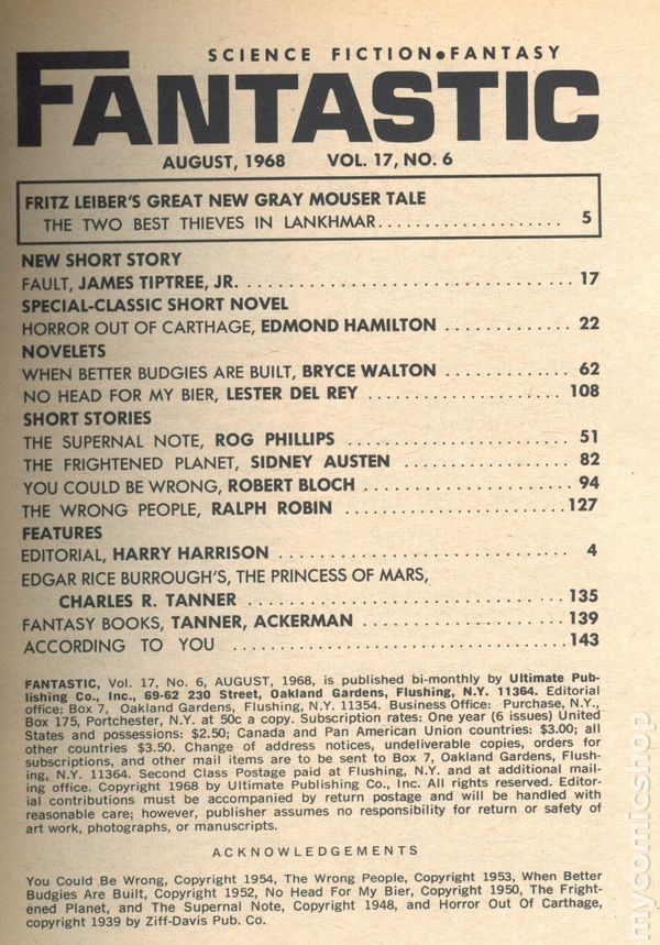 Aug 1968. Science fiction and fantasy stories by Fritz Leiber, James Tiptree, Jr., Edmond Hamilton, Bryce Walton, Lester Del Rey, Rog Phillips, Sidney Austen, Robert Bloch, and Ralph Robin. Illustrations by Jeff Jones, Jay Jackson, William A. Gray, William Slade, J. Allen St. John, Virgil Finlay, and Emshwiller 5.5-in. x 7.75-in.; black and white; 146 newsprint pages. Cover price $0.50.