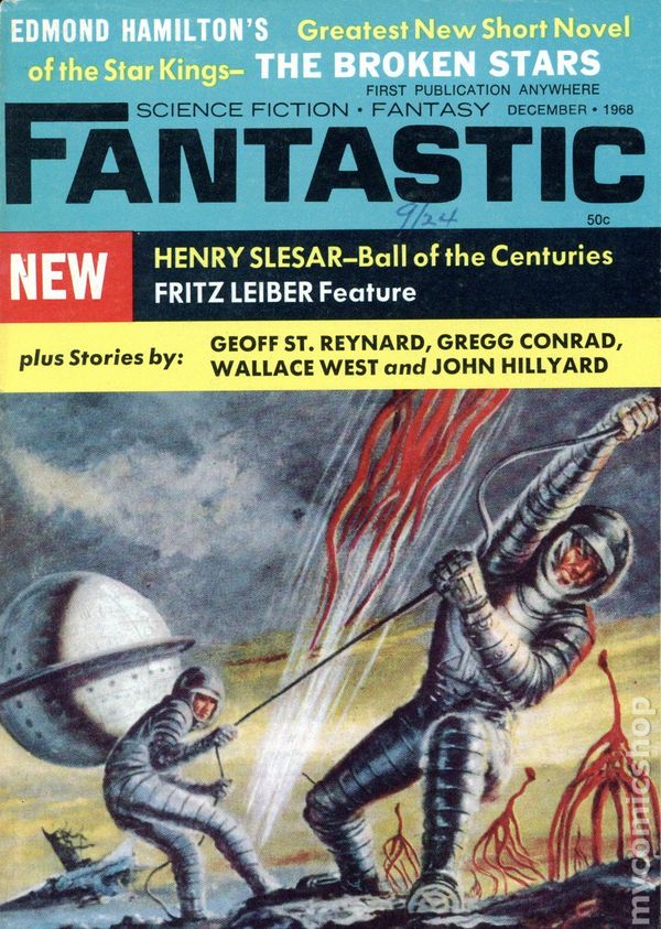 December 1968. Science Fiction and Fantasy Stories: "The Broken Stars" by Edmond Hamilton, "Ball of the Centuries" by Henry Slesar, "The Prophecy" by Bill Pronzini, "The Disenchanted" by Wallace West and John Hillyard, "The Mental Assassins" by Gregg Conrad, "The Usurpers" by Geoff St. Reynard, and "The Collectors" by Gordon Dewey. Softcover Pulp Digest, 5 1/2-in x 8-in, 162 Pages, B&W. Cover price $0.50.
