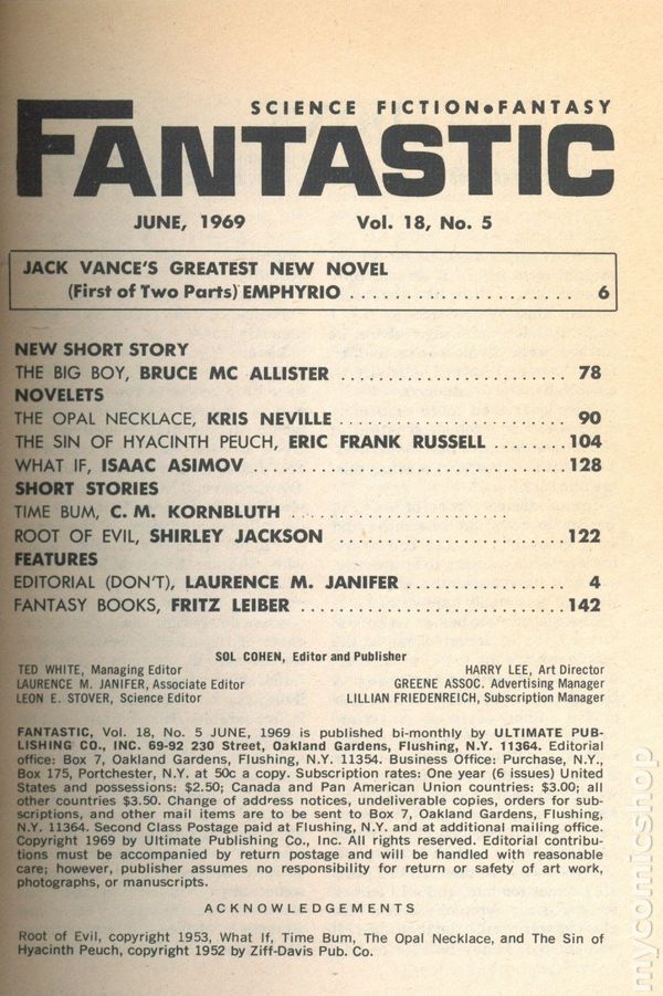 Aug 1969. Science fiction and fantasy stories by Alexei Panshin, Randall Garrett, Robert Bloch, Tony Boucher, Richard Matheson, Robert Sheckley, Henry Slesar, and Jack Vance ("Emphyrio" part 2). Two Bruce Jones illustrations. 5.5-in. x 7.75-in.; black and white; 144 newsprint pages. Cover price $0.50.