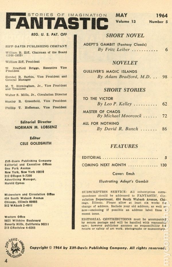 Cover by Ed Emshwiller. Stories by Fritz Leiber, Adam Bradford, Leo P. Kelley, Michael Moorcock, David R. Bunch. Illustrations by Emsh, George Schelling, Virgil Finlay, Lutjens, Blair. 5.5-in. x 7.75-in.; black and white; 162 newsprint pages. Cover price $0.50.
