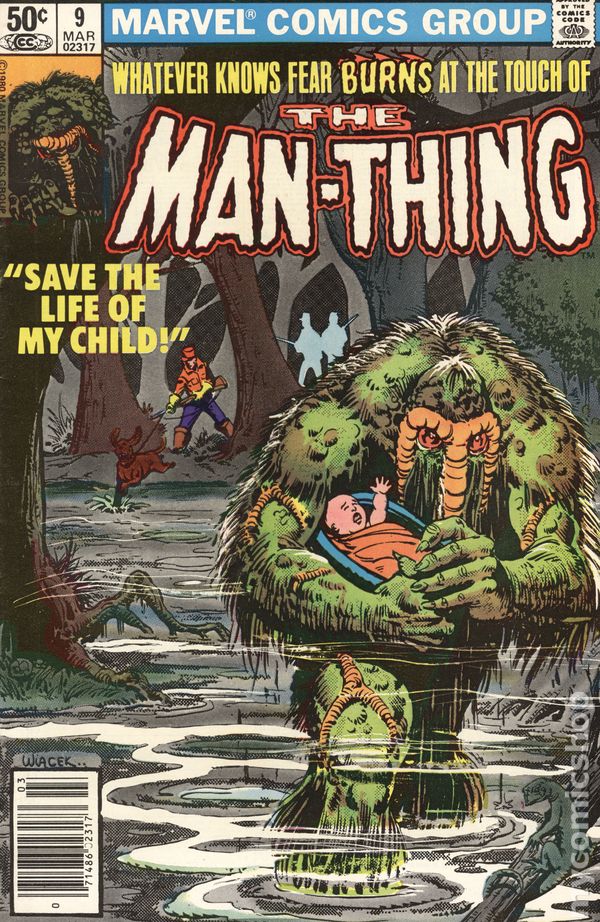 Newsstand Edition. "The Echo of Pain!" Written by Dickie McKenzie. Art by Larry Hama and Danny Bulandi. While Barb's quest begin, the Man-thing finds himself in a whole other kind of trouble as he suddenly becomes responsible for the life of an infant! 32 pages, FC. Cover price $0.50.