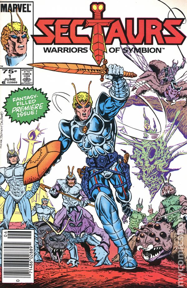 Newsstand Edition. Upheaval! - Written by Bill Mantlo. Art by Mark Texeira, Joe Del Beato and Art Nichols. Cover by Mark Texeira, Bret Blevins and Joe Del Beato. Fantasy-filled premiere issue! New from the House of Ideas -- Marvel goes beyond reality as we know it to bring you an entire race of super-beings: the Sectaurs! Led by Dargon, heir to the throne of the Shining Realm, the heroes of Symbion must fight to save their world from the merciless hordes of Empress Devora! Plus: 1-page "The World of Symbion" map. Printed on Mando paper. 32 pages, full color. Cover price $0.75.