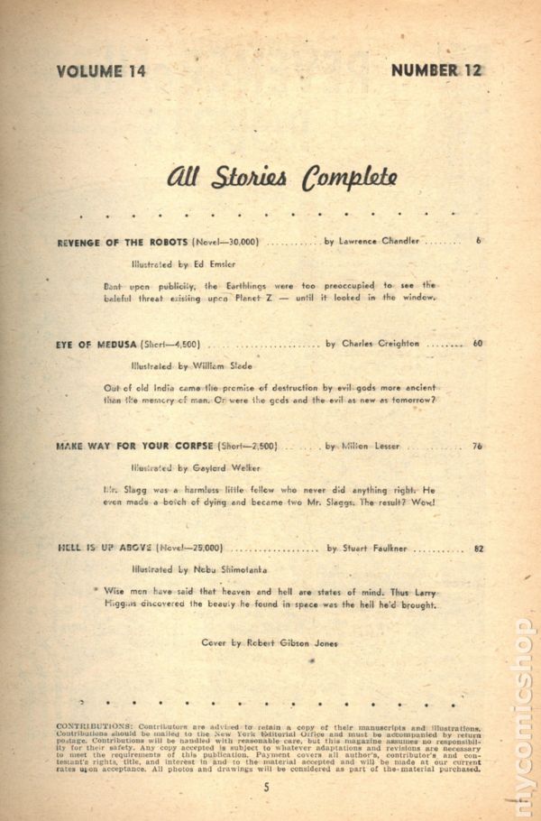 December 1952. Cover by Robert Gibson Jones. Stories include "Revenge of the Robots" by Lawrence Chandler, "Eye of Medusa" by Charles Creighton, "Make Way for Your Corpse" by Milton Lesser, "Hell Is Up Above" by Stuart Faulkner. Illustrations by Ed Emsler, William Slade, Gaylord Welker, and Nobu Shimotanka. 7-in. x 10.-in.; black and white; 130 newsprint pages. Cover price $0.25.