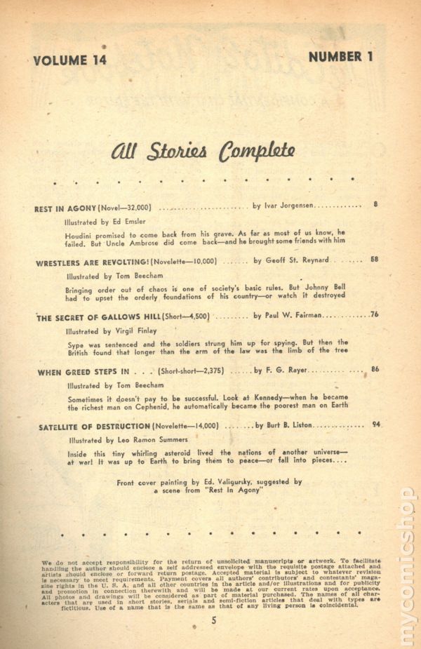 Ziff Davis, NY, 1952. Vol. 14, No. 1. Pulp magazine. Edited by Howard Browne. Cover art by Ed Valigursky for "Rest in Agony" (novel) by Ivar Jorgensen [Paul W. Fairman]. Includes "Wrestlers Are Revolting!" (novelette) by Geoff. St. Reynard; "The Secret of Gallows Hill" by Paul W. Fairman; "When Greed Steps in" (short-short) by F. G. Rayer; "Satellite of Destruction" (novelette) by Burt B. Liston. Features: "The Editor's Notebook"; "That's Fast, Brother!" by Dale Lord; "The Wrath of Rust" by Wilton Avery MacDonald; "Xenon for the Future" by June Lurie; "DDT - The Merciful" by Jon Barry; "One De-Gaussing Girlde, please" by A. T. Kedzie; "No Heartaches on the Moon" by Salem Lane; "The Robot with the Spying Eyes" by Merritt Linn; "Smashed - One Satellite!" by Rita Glanzman; "More Science - More Future" by Walt Crain; "Morpheus in Hades!" by E. Bruce Yaches; "The Girl Was a Killer!" by John Weston; "Man Is Not Alone" by Carter T. Wainwright; "Pipelines Carry Juice" by L. A. Burt; "The Dying Protest" by Glen Otis; "The Flying Eggbeater" by Russell Newton Roman; "Repulsion Attracts" by Tom Lynch; "Terran Treachery Trips Luna" by Charles Recour; "Reader's page"; "To the Ends of the Earth" by Jonathan Peterson. Illustrated by Ed Emsler, Tom Beecham, Virgil Finlay, and Leo Ramon Summers. Letters from Terry Carr and others. Softcover Pulp, 7-in x 10-in, 134 Pages, B&W. Cover price $0.25.