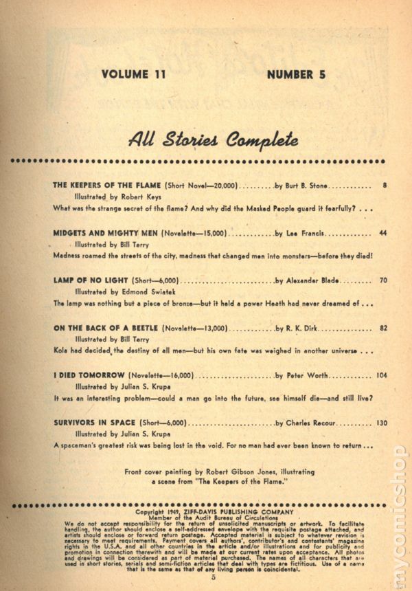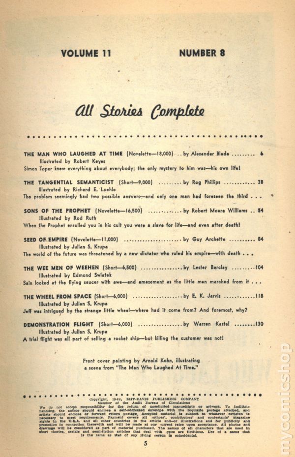 Volume 12, Issue 11 - November, 1950. Cover by Arnold Kohn (incorrectly credited to R.G. Jones). Science Fiction and Adventures stories. This issue features "Mistress of the Djinn" by Geoff St. Reynard and "The Dreaming Trees" by John Jakes (1st published work). Softcover Pulp, 7-in x 10-in, 132 Pages, B&W. Cover price $0.25.