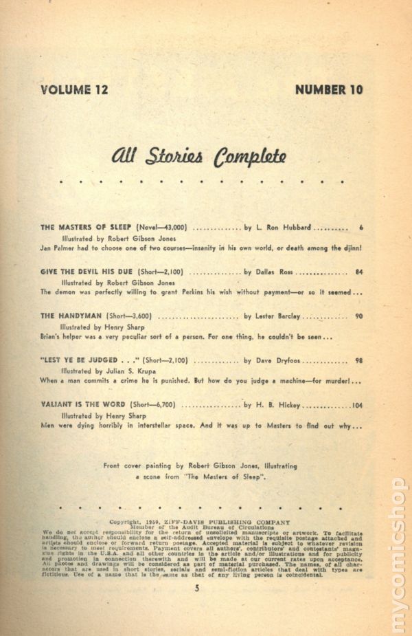 Volume 12, Issue 10 - October 1950. Cover by Robert Gibson Jones. Science Fiction and Adventures stories. This issue features "The Masters of Sleep!" by Lafayette Ronald Hubbard. Softcover Pulp, 7-in x 10-in, 132 Pages, B&W. Cover price $0.25.