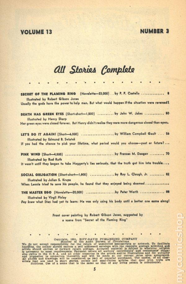 Volume 13, Issue 3 - March, 1951. Cover by Robert Gibson Jones. Stories include "Secret of the Flaming Ring" by P. F. Costello, "Death has Green Eyes" by John W. Jakes, "Let's Do It Again" by William Campbell Gault, "Pink Wind" by Frances M. Deegan, "Social Obligation" by Roy L. Clough, Jr., and "The Master Ego" by Peter Worth. Illustrations by Robert Gibson Jones, Henry Sharp, Edmund B. Swiatek, Rod Ruth Julian S. Krupa, and Virgil Finlay. 7-in. x 9.75-in.; black and white; 132 newsprint pages. Cover price $0.25.