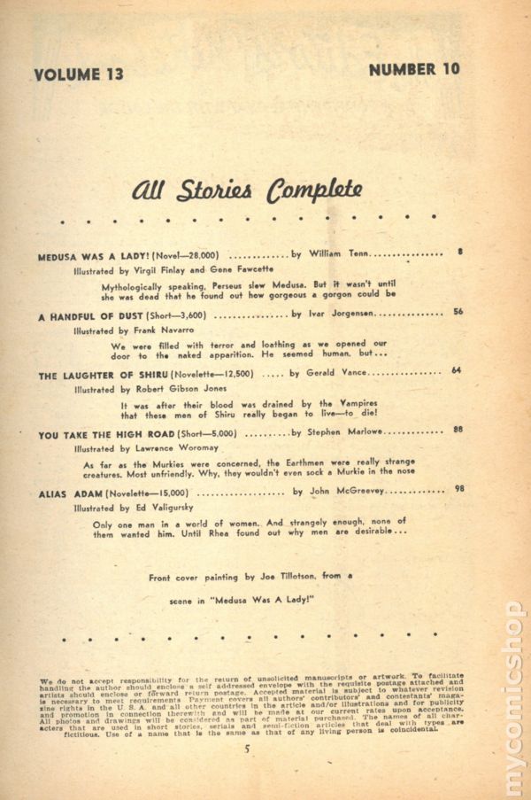 Volume 13, Issue 10 - October, 1951. Cover by Joe Tillotson. Science Fiction and Adventures stories. This issue features "Medusa Was a Lady" by William Tenn. Softcover Pulp, 7-in x 10-in, 132 Pages, B&W. Cover price $0.25.