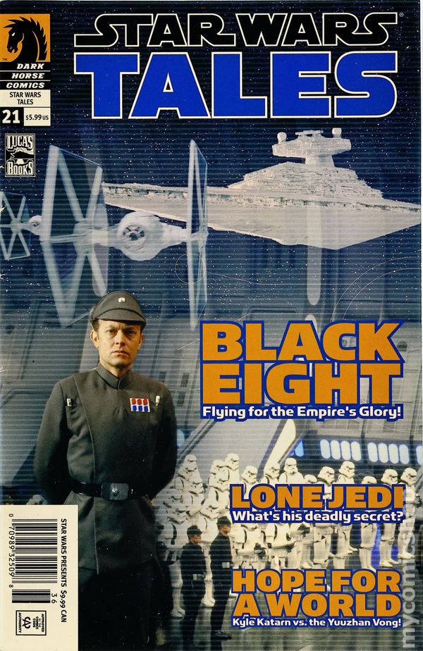 Newsstand Edition. Story by Nathan P. Butler, Rob Williams, and Shane McCarthy. Art by Michael Lacombe, Brandon Badeaux, and James Raiz. Photo Cover. On sale September 8, FC, 64pg, (Bermejo and photo cover), $5.99 This is it? the beginning of a new direction for Star Wars Tales! Stepping away from the shorter, sillier Star Wars stories, with this issue Tales goes full-tilt toward a more exciting and sophisticated storytelling style. Cla$$war writer Rob Williams and Man of Steel artist Brandon Badeaux team up to bring you the story of Darca Nyl?a Jedi wandering the galaxy's Outer Rim hunting for revenge and hiding a deadly secret. Writer Shane McCarthy presents a rag-tag group of convicts and cutthroats flying for the Empire's glory in the feared TIE Fighter squadron called "Black Eight." And Kyle Katarn, star of the hit video game Jedi Outcast, goes toe-to-toe with the vile Yuuzhan Vong, in an action-packed tale by Nathan P. Butler and James Raiz (Tokyo Storm Warning). ? Cover by Lee Bermejo (Batman/Deathblow; Batman: Gotham Knights) ? New-reader friendly ? each story is self-contained and easily accessible. Cover price $5.99.