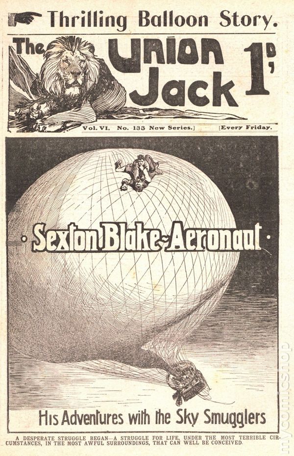 The Union Jack was a "penny dreadful" type of UK publication that ran from 1894 to 1933. In 1904, Sexton Blake, "the poor man's Sherlock Holmes," became the star of every issue. Mostly text with a few illustrations, 7-1/2" x 11", 36 pages newsprint, b&w.