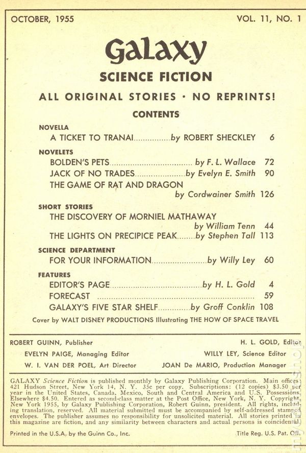 November 1954. Cover by Emsh. Stories: "How-2" by Clifford D. Simak, "The Music Master of Babylon" by Edgar Pangborn, "Big Ancestor" by F. L. Wallace, "The Nostalgia Gene" by Roy Hutchins, "The Laxian Key" by Robert Sheckley, "Up For Renewal" by Lucius Daniel, and "The Age of Kindness" by Arthur Sellings. 5.25-in. x 7.5-in.; 160 Pages, B&W. Cover price $0.35.