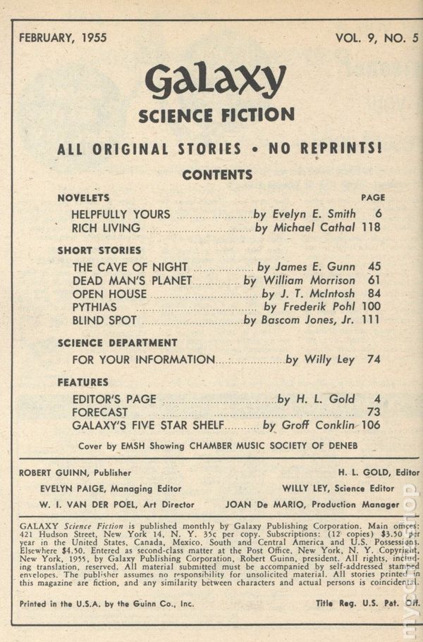 February 1955. Cover by Emsh. Stories: "Helpfully Yours" by Evelyn E. Smith, "Rich Living" by Michael Cathal, "The Cave of Night" by James E. Gunn, "Dead Man's Planet" by William Morrison, "Open House" by J.T. McIntosh, "Pythias" by Frederik Pohl, and "Blind Spot" by Bascom Jones Jr. 5.25-in. x 7.5-in.; 144 Pages, B&W. Cover price $0.35.