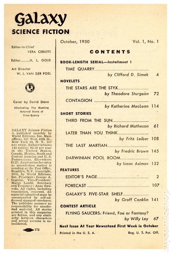 First Issue, October 1950. Cover by David Stone. Stories: "Time Quarry"(Part 1) by Clifford D. Simak, "The Stars are the Styx" by Theodore Sturgeon, "Contagion" by Katherine MacLean, "Third From the Sun" by Richard Matheson, "Later Than You Think" by Fritz Leiber, "The Last Martian" by Fredric Brown, "Darwinian Pool Room" by Isaac Asimov. 5.25-in. x 7.5-in.; 160 Pages, B&W. Cover price $0.25.