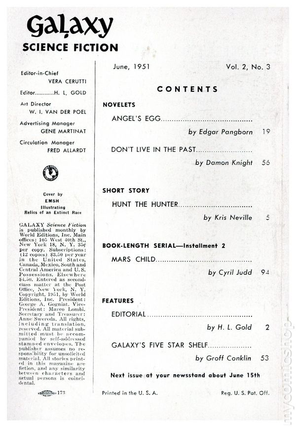 April 1951. Cover by Emsh. Stories: "Angel's Egg" by Edgar Pangborn, "Don't Live in the Past" by Damon Knight, "Hunt the Hunter" by Kris Neville, and "Mars Child"(Part 2) by Cyril Judd. 5.25-in. x 7.5-in.; 160 Pages, B&W. Cover price $0.35.