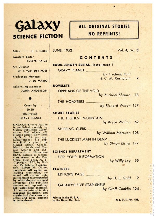 June 1952. Cover by Emsh. Stories: "Gravy Planet"(Part 1) by Frederik Pohl and C. M. Kornbluth, "Orphans of the Void" by Michael Shaara, "The Hoaxters" by Ricard Wilson, "The Highest Mountain" by Bryce Walton, "Shipping Clerk" by William Morrison, and "The Luckiest Man in Denv" by Simon Eisner. 5.25-in. x 7.5-in.; 160 Pages, B&W. Cover price $0.35.