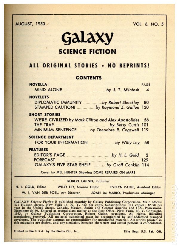August 1953. Cover by Mel Hunter. Stories: "Mind Alone" by J. T. M'Intosh, "Diplomatic Immunity" by Robert Sheckley, "Stamped Caution!" by Raymond Z. Gallun, "We're Civilized" by Mark Clifton and Alex Apostolides, "The Trap" by Betsy Curtis, and "Minimum Sentence" by Theodore R. Cogswell. 5.25-in. x 7.5-in.; 160 Pages, B&W. Cover price $0.35.
