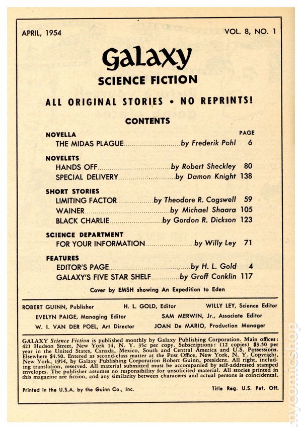 Volume 8, Issue 1 - April 1954. Cover by Emsh. Science Fiction and Adventure Pulp magazine. Stories include "The Midas Plague" by Frederik Pohl,"Hands Off" yb Robert Sheckley, "Special Delivery" by Damon Knight, "Limiting Factor" by Theodore R. Cogswell, "Wainer" by Michael Shaara, and "Black Charlie" by Gordon R. Dickson. 5.25-in. x 7.5-in.; 160 Pages, B&W. Cover price $0.35.