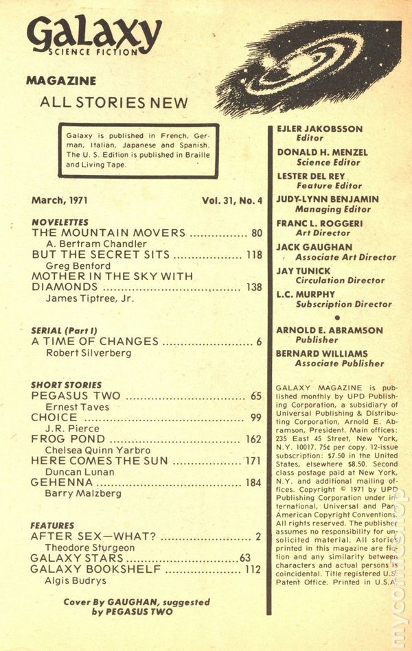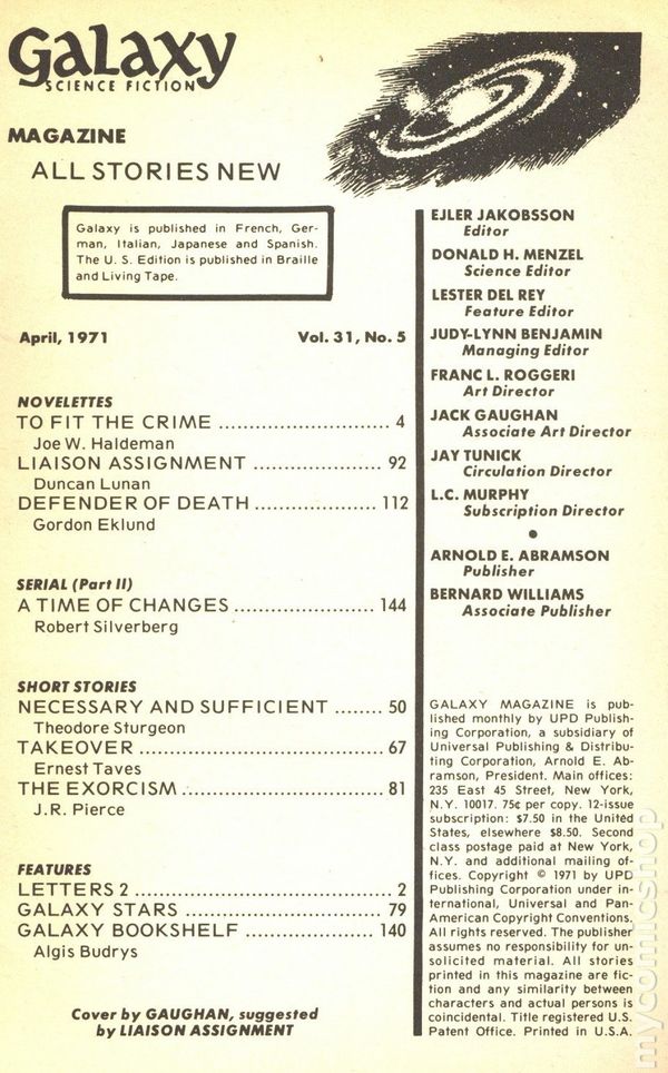 April 1971. Cover by Jack Gaughan. Science fiction stories by Joe W. Halderman, Duncan Lunan, Gordon Eklund, Robert Silverberg's "A Time of Changes" Part 2, Theodore Sturgeon, Ernest Taves, and J. R. Pierce. 5-1/4-in. x 7-1/4-in.; b&w text with spot illustrations; 192 newsprint pages. Cover price $0.75.