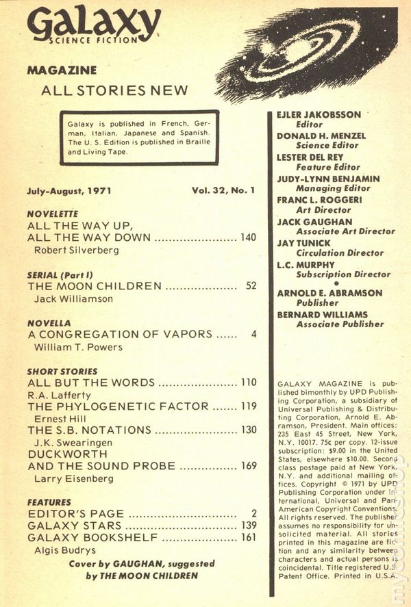 July-August 1971. Cover by Jack Gaughan. Science fiction stories by Robert Silverberg, Jack Williamson, William T. Flowers, R. A. Lafferty, Ernest Hill, J. K. Swearingen, Larry Eisenberg. Illustrations by Gaughan. 5-1/4-in. x 7-1/4-in.; b&w text with spot illustrations; 176 newsprint pages. Cover price $0.75.