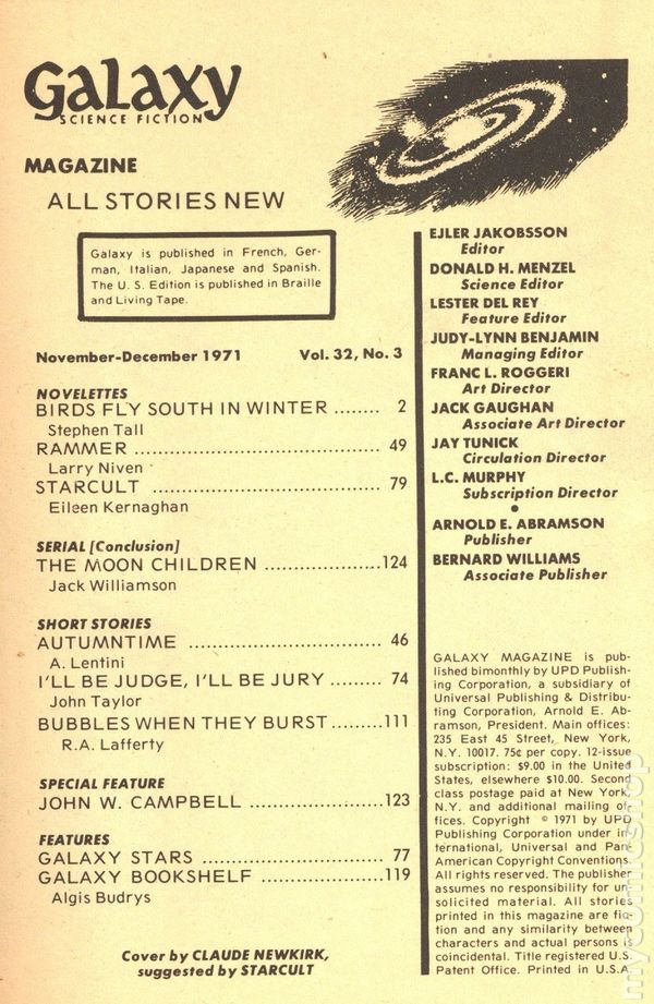November 1971. Cover by Claude Newkirk. Science fiction stories by Stephen Tall, Larry Niven, Eileen Kernaghan, Jack Williamson, A. Lentini, John Taylor, R. A. Lafferty. Illustrations by Gaughan, Newkirk. 5-1/4-in. x 7-1/4-in.; b&w text with spot illustrations; 192 newsprint pages. Cover price $0.75.