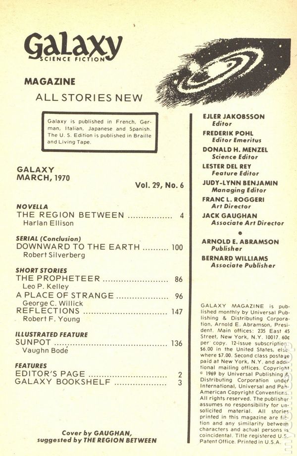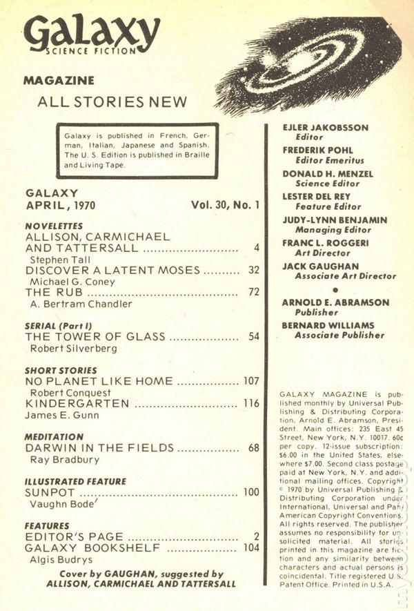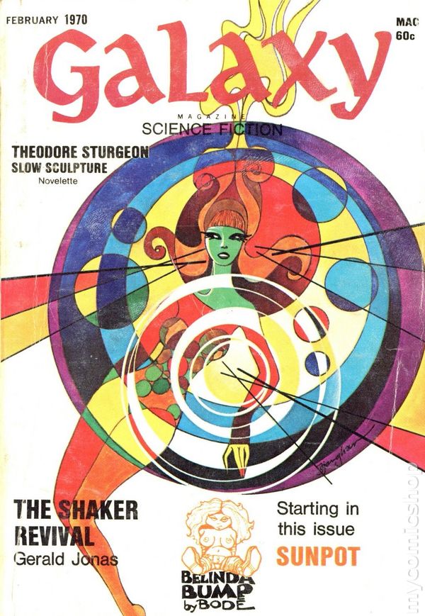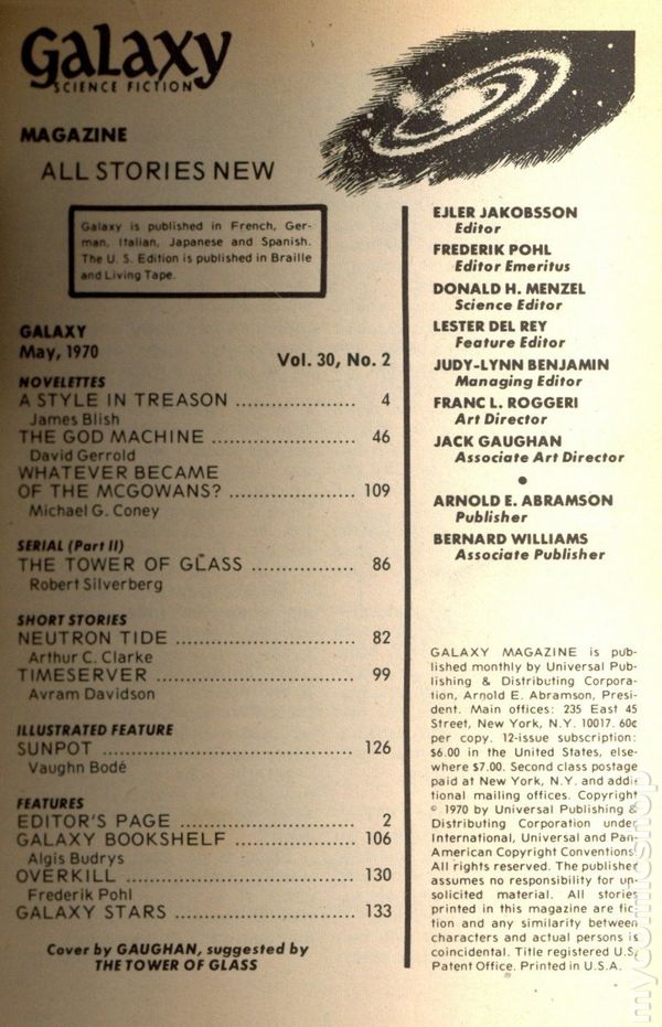 May 1970. Cover by Brock Gaughan. Science fiction stories by James Blish, David Gerrold, Michael G. Coney, Robert Silverberg's "The Tower of Glass" Part 2, Arthur C. Clarke, and Avram Davidson. Illustrated comic strip feature "Sunspot" by Vaughn Bode. Illustrations by Gaughan. 5-1/4-in. x 7-1/4-in.; b&w text with spot illustrations; 160 newsprint pages. Cover price $0.60.