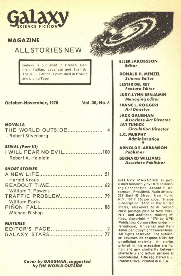 August-September 1970 - Volume 30, Issue 5. Cover by Brock Gaughan. Stories include "The Day After Judgement" by James Blish, Part 2 of "I will Fear No Evil" by Robert A. Heinlein, the Short Stories "About a Secret Crocodile" by R.A. Lafferty, "Power Play" by Dannie Plachta, and "Moon Heat" by Ernest Taves. 5 1/4-in. x 7 1/2-in., 192 pages, Text (with B&W illustrations and photos) Cover price $0.75.