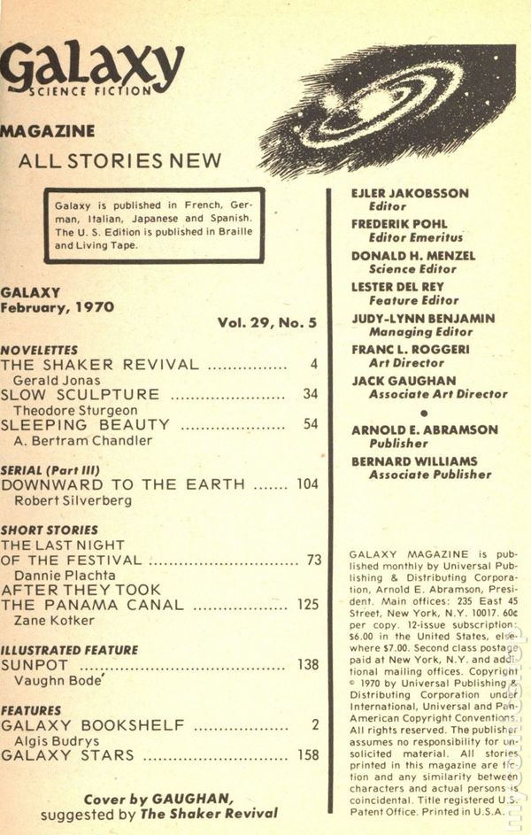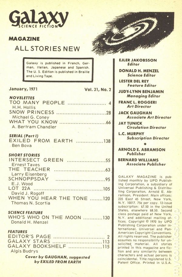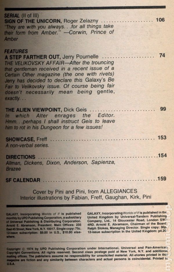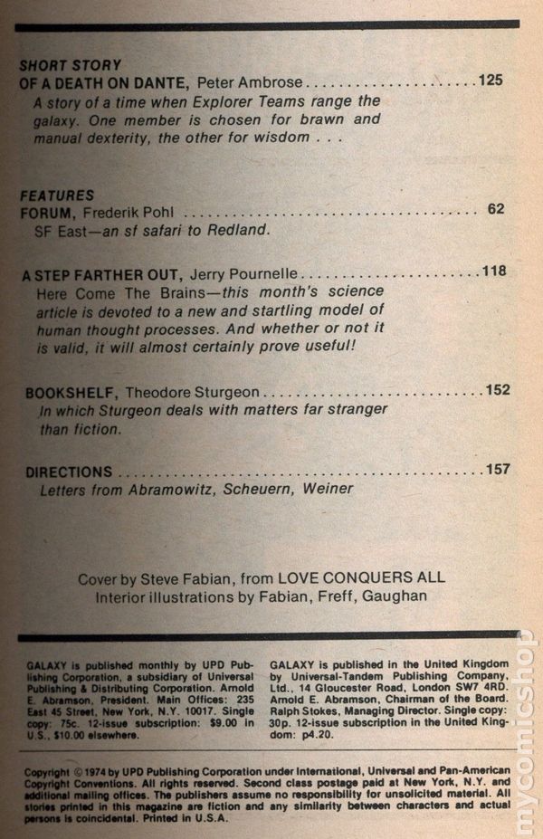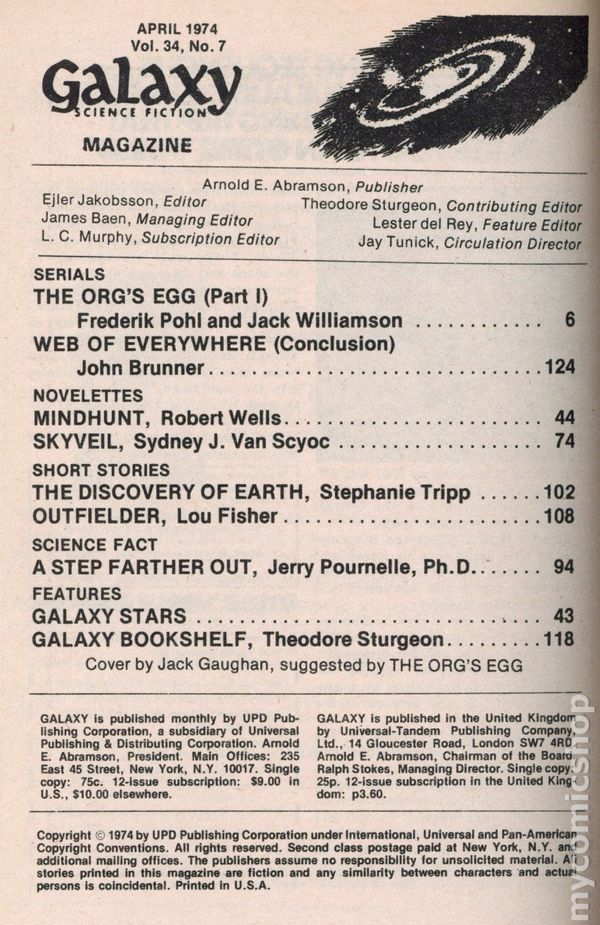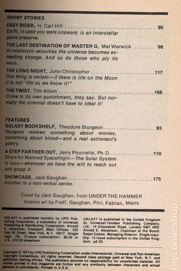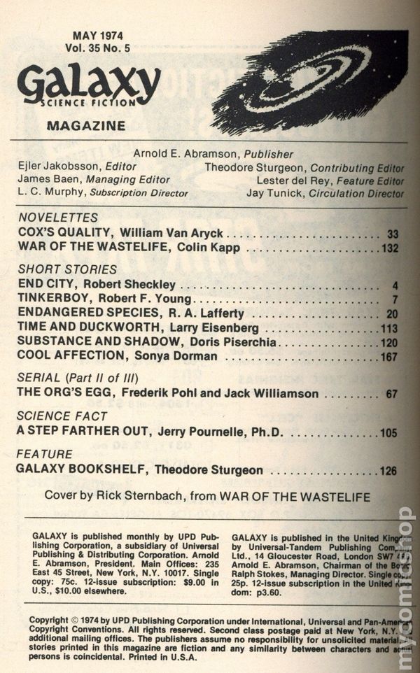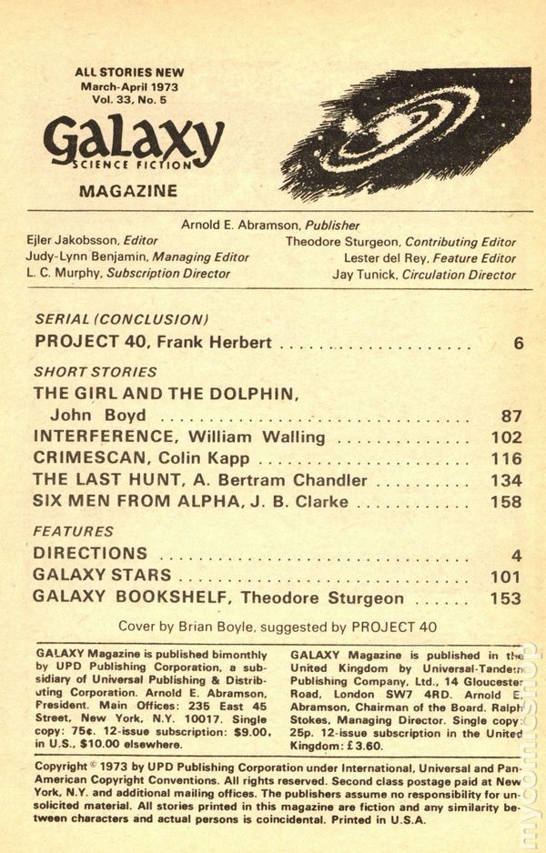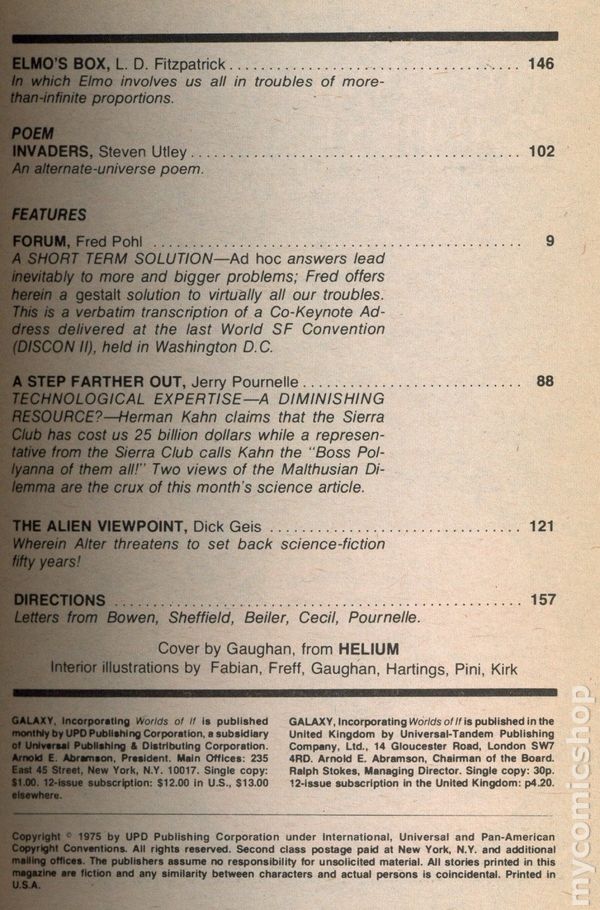 Cover by Brian Boyle. Science fiction stories by Michael Kurland, Robert Sheckley, Ernest Taves, William E. Wilson, Frederik Pohl, R. A. Lafferty, James White. Illustrations by Gaughan. 5-1/4-in. x 7-1/4-in.; b&w text with spot illustrations; 176 newsprint pages. Cover price $0.75.