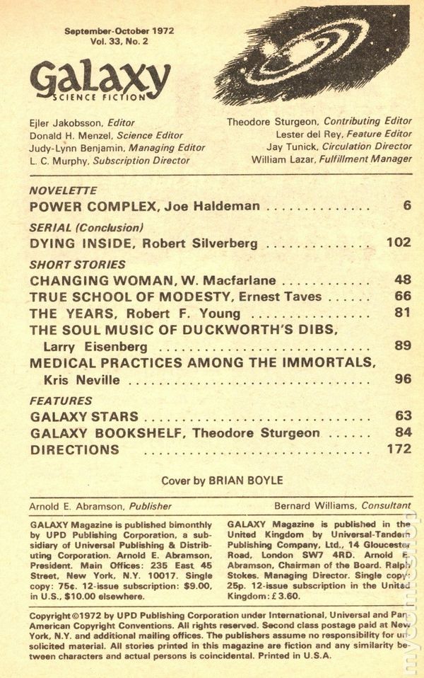 September-October 1972. Cover by Brian Boyle. Science fiction stories by Joe Haldeman, Robert Silverberg, W. Macfarlane, Ernest Taves, Robert F. Young, Larry Eisenberg, Kris Neville. Illustrations by Gaughan. 5-1/4-in. x 7-1/4-in.; b&w text with spot illustrations; 176 newsprint pages. Cover price $0.75.