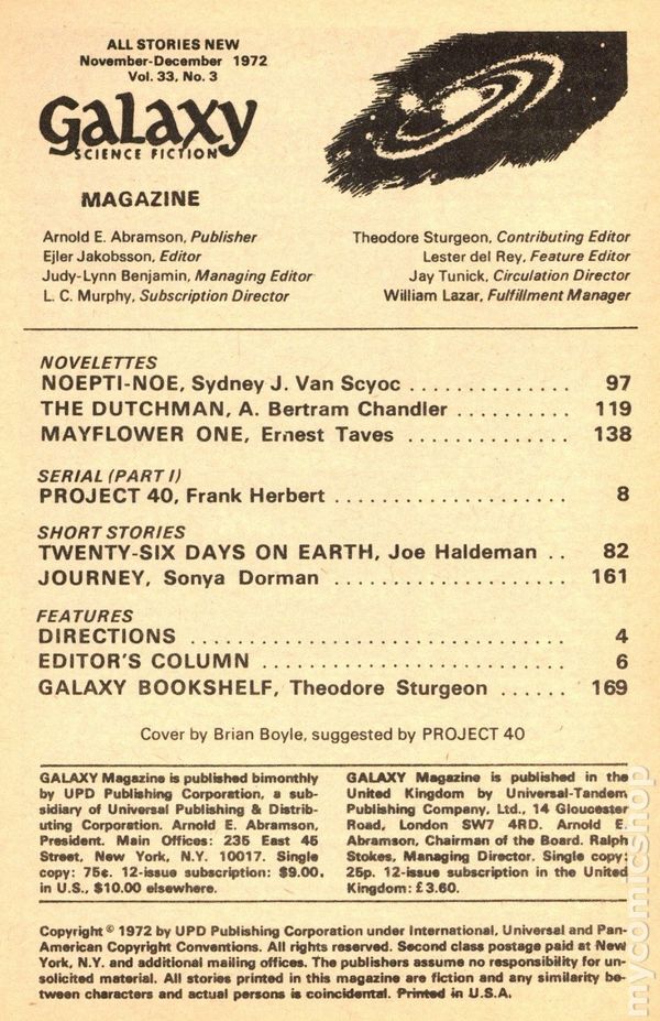 November-December 1972. Cover by Brian Boyle. Science fiction stories by Sydney J. Van Scyoc, A. Bertram Chandler, Ernest Taves, Frank Herbert, Joe Haldeman, Sonya Dorman. Illustrations by Gaughan. 5-1/4-in. x 7-1/4-in.; b&w text with spot illustrations; 176 newsprint pages. Cover price $0.75.