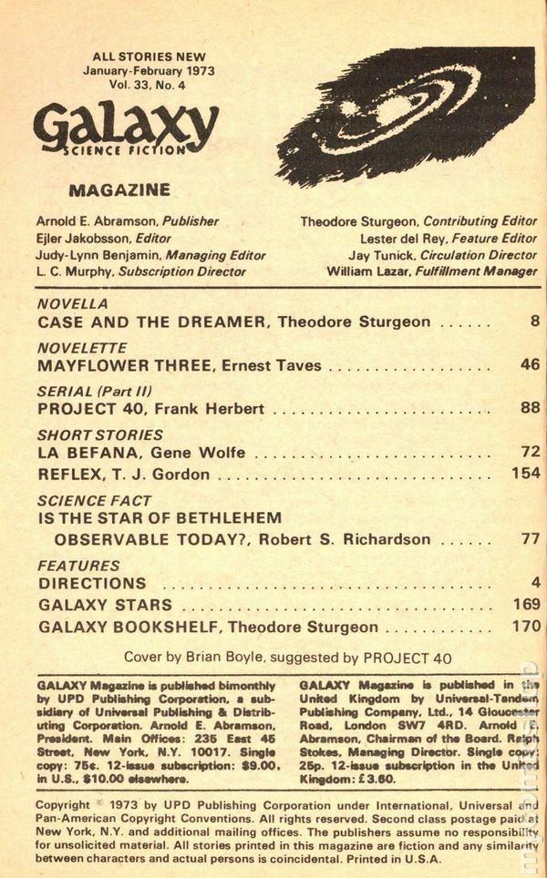 January-February 1973. Cover by Brian Boyle. Science fiction stories by Theodore Sturgeon, Ernest Taves, Frank Herbert, Gene Wolfe, T. J. Gordon. Illustrations by Gaughan, Adkins. 5-1/4-in. x 7-1/4-in.; b&w text with spot illustrations; 176 newsprint pages. Cover price $0.75.