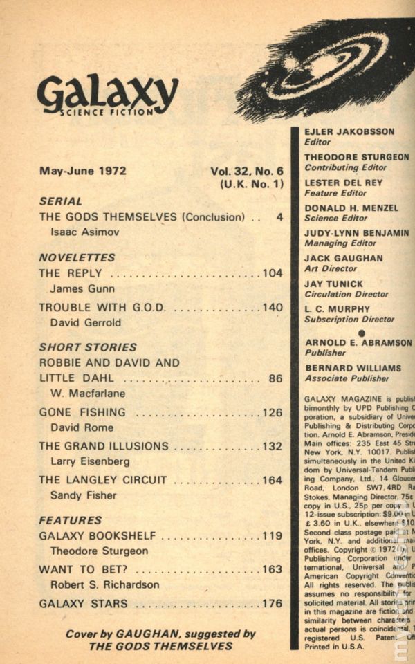 View scansCover by Jack Gaughan. Science fiction stories by Isaac Asimov, James Gunn, David Gerrold, W. Macfarlane, David Rome, Larry Eisenberg, Sandy Fisher. Illustrations by Gaughan. 5-1/4-in. x 7-1/4-in.; b&w text with spot illustrations; 192 newsprint pages. Cover price $0.75.