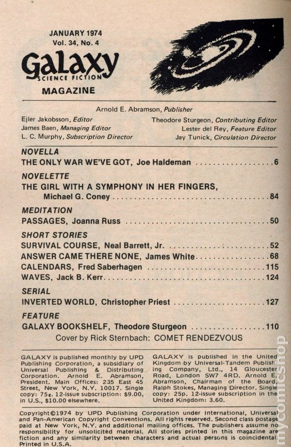 Cover by Rick Sternbach. Science fiction stories by Joe Haldeman, Michael G. Coney, Joanna Russ, Neal Barrett Jr, James White, Fred Saberhagen, Jack B. Kerr, Christopher Priest. Illustrations by Jack Gaughan. 5-1/4-in. x 7-1/4-in.; b&w text with spot illustrations; 176 newsprint pages. Cover price $0.75.