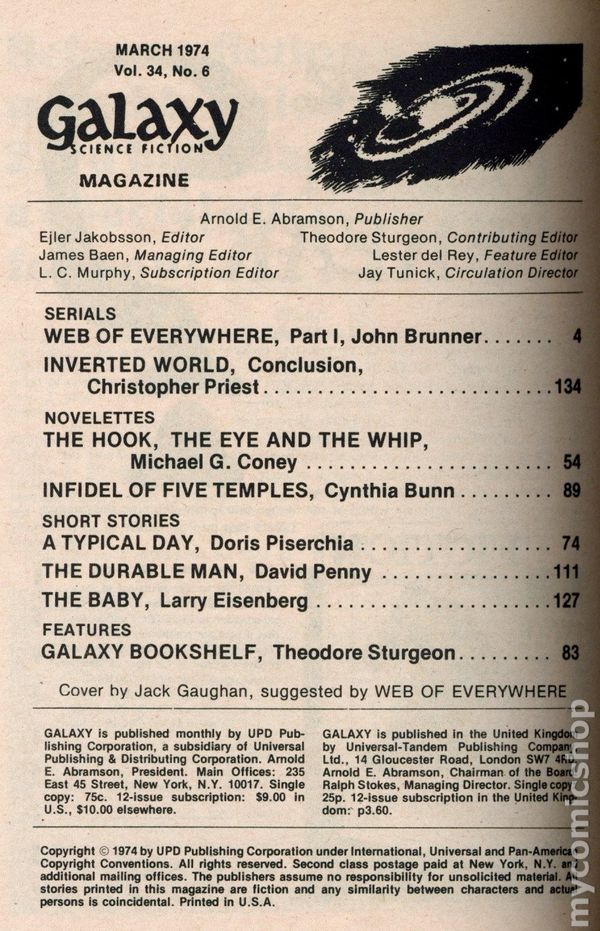 Cover by Jack Gaughan. Science fiction stories by John Brunner, Christopher Priest, Michael G. Coney, Cynthia Bunn, Doris Piserchia, David Penny, Larry Eisenberg. Illustrations by Jack Gaughan. 5-1/4-in. x 7-1/4-in.; b&w text with spot illustrations; 176 newsprint pages. Cover price $0.75.