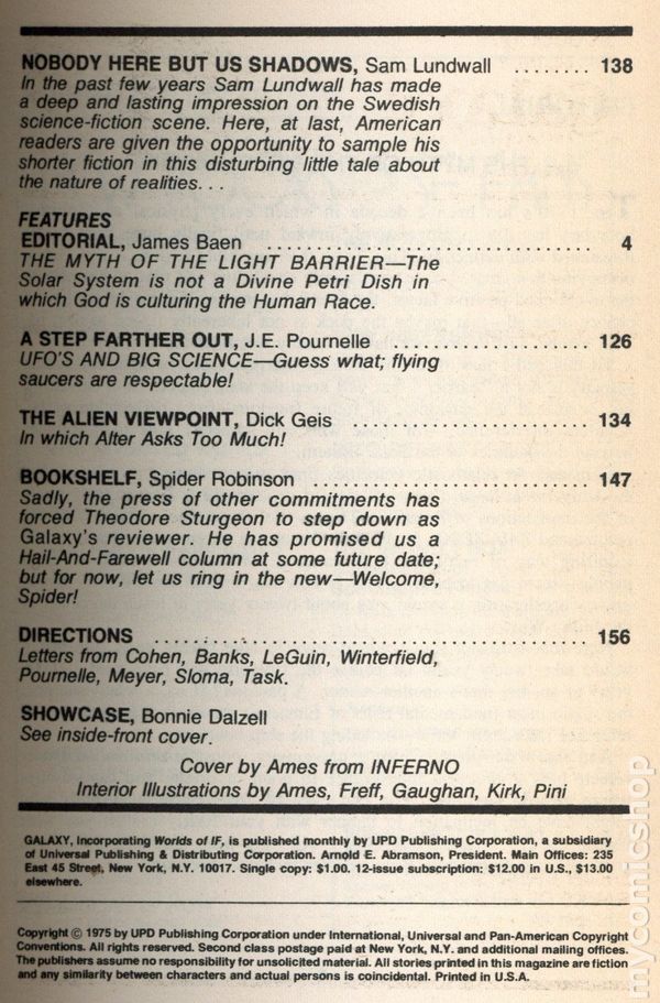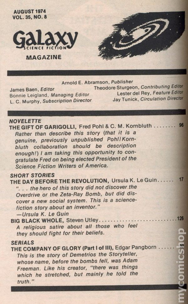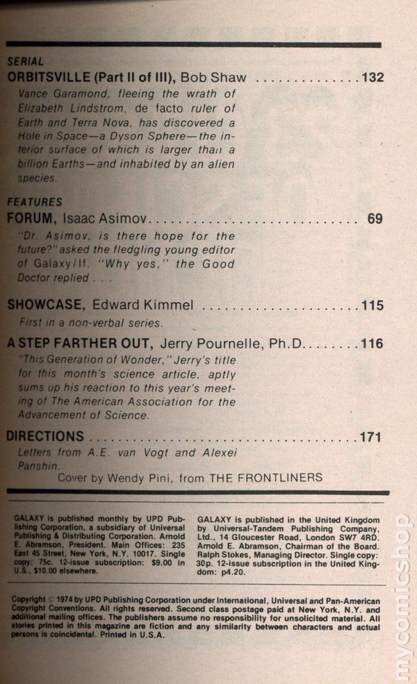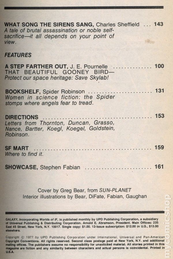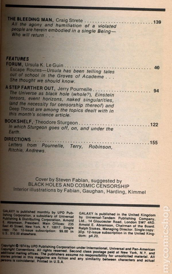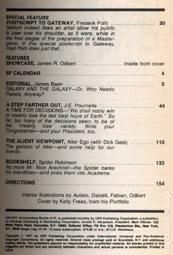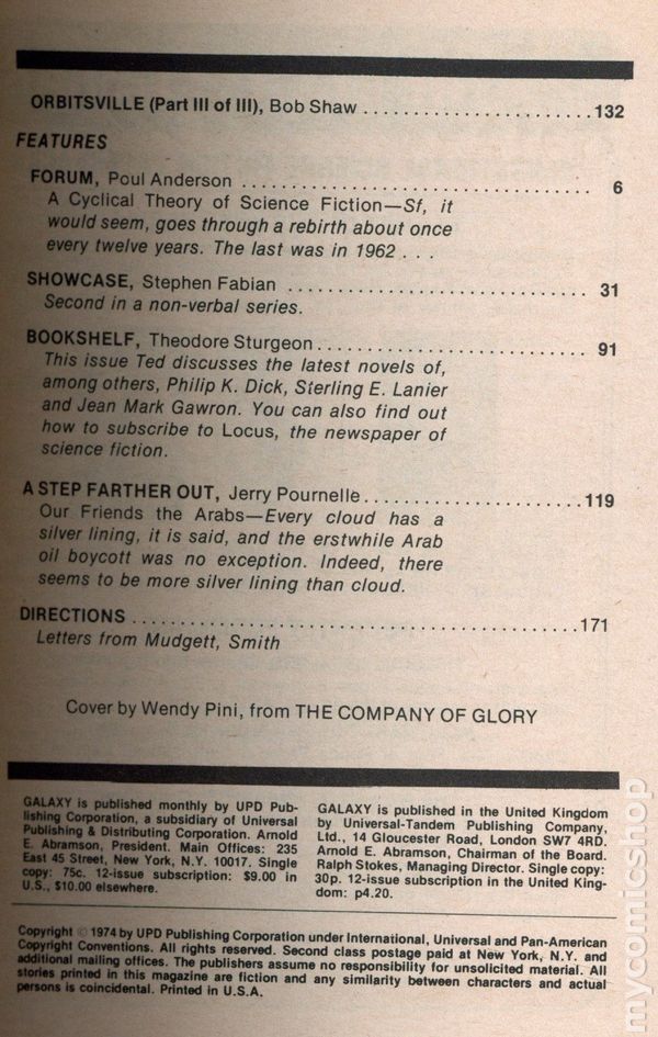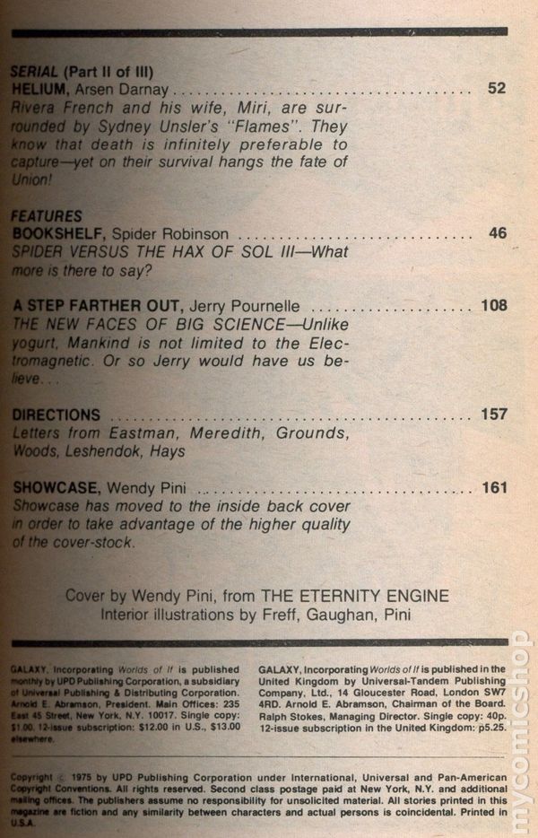 Cover by Wendy Pini. Science fiction stories by Frederick Pohl, C. M. Kornbluth, Ursula K. Le Guin, Steven Utley, Edgar Pangborn, Bob Shaw. Illustrations by Jack Gaughan, Stephen Fabian. 5-1/4-in. x 7-1/4-in.; b&w text with spot illustrations; 176 newsprint pages. Cover price $0.75.