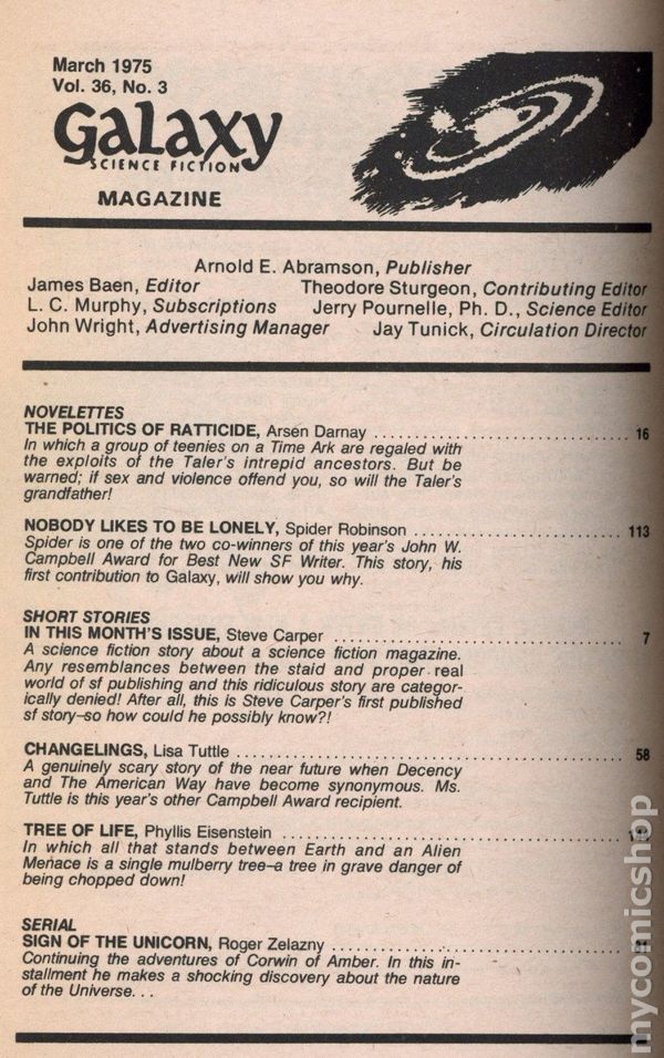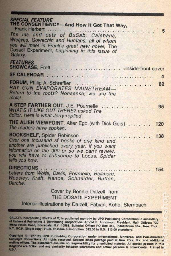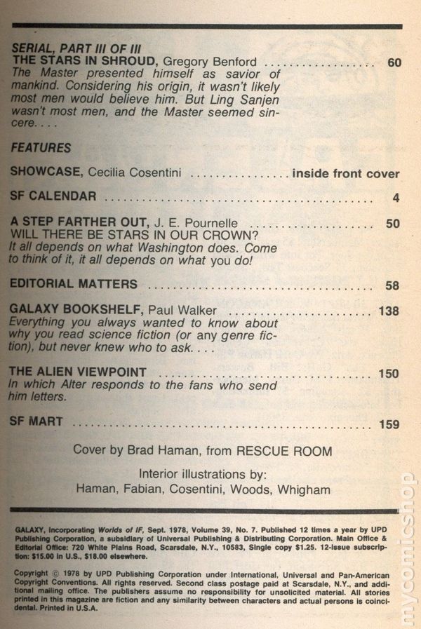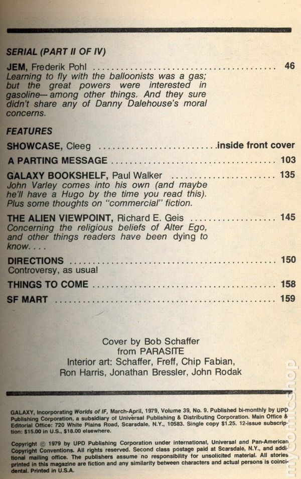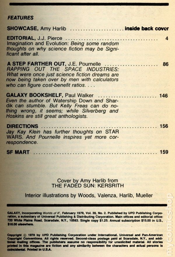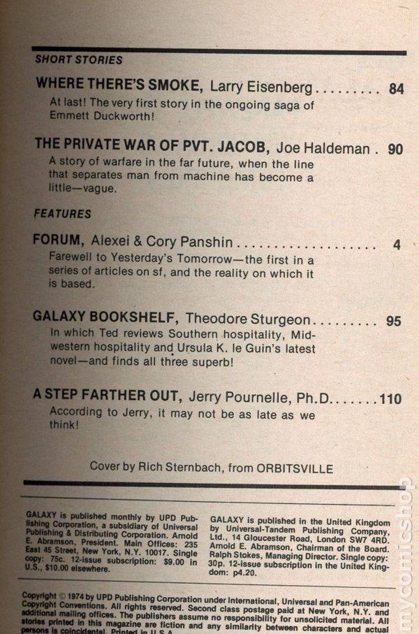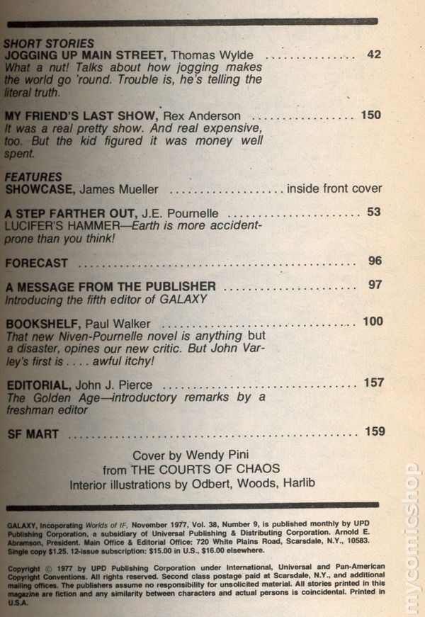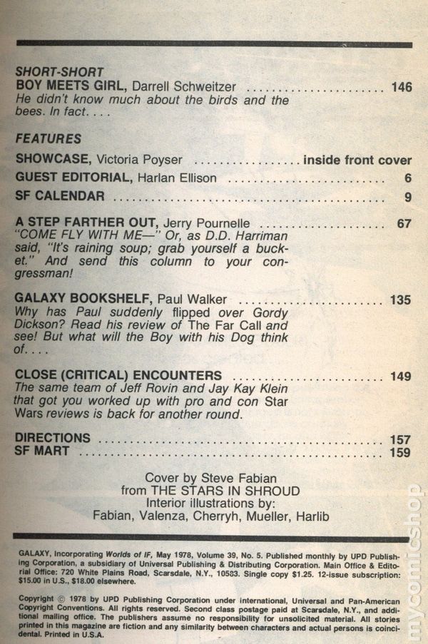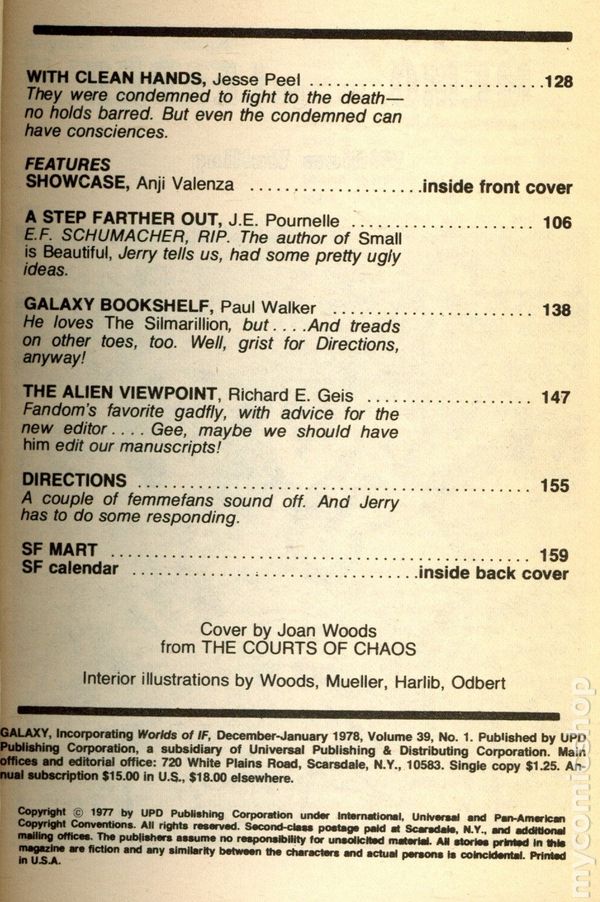 Cover by Wendy Pini. Science fiction stories by Frederick Pohl, C. M. Kornbluth, Ursula K. Le Guin, Steven Utley, Edgar Pangborn, Bob Shaw. Illustrations by Jack Gaughan, Stephen Fabian. 5-1/4-in. x 7-1/4-in.; b&w text with spot illustrations; 176 newsprint pages. Cover price $0.75.