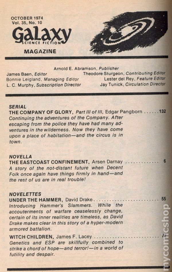 October 1974. Cover by Jack Gaughan. Science fiction stories by Edgar Pangborn, Arsen Darnay, David Drake, James F. Lacey, H. Carl Hill, Mal Warwick, John Christopher, Tim Altom. Illustrations by Fabian, Gaughan, Freff, Marrs, Wendy Pini. 5-1/4-in. x 7-1/4-in.; b&w text with spot illustrations; 192 newsprint pages. Cover price $0.75.