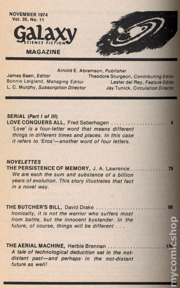 November 1974. Cover by Steve Fabian. Science fiction stories by Fred Saberhagen, J. A. Lawrence, David Drake, Herbie Brennan, Peter Ambrose. Illustrations by Jack Gaughan, Fabian, Freff. 5-1/4-in. x 7-1/4-in.; b&w text with spot illustrations; 192 newsprint pages. Cover price $0.75.
