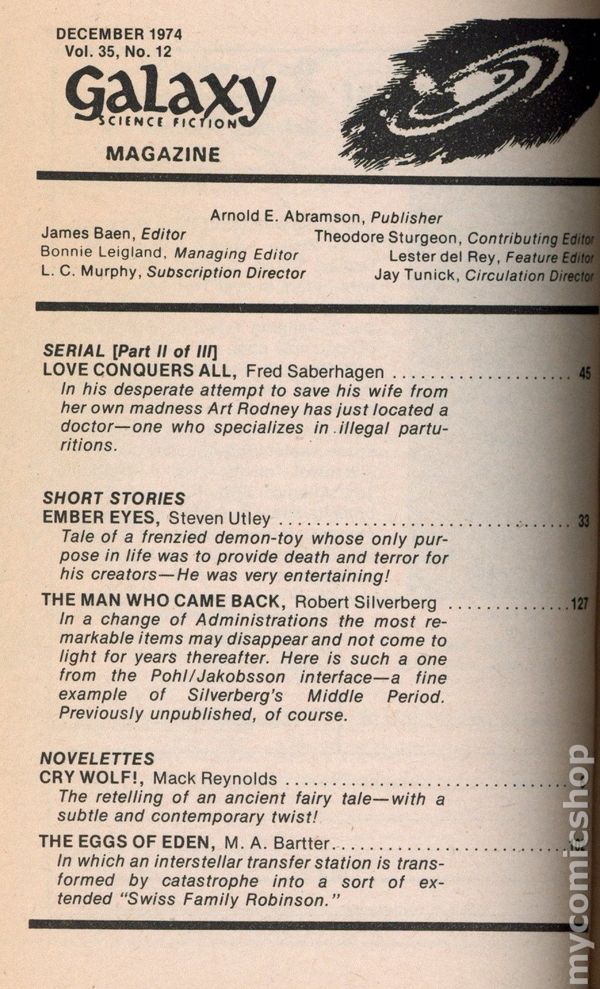 December 1974. Cover by Steve Fabian. Science fiction stories by Fred Saberhagen, Steve Utley, Robert Silverberg, Mack Reynolds, M. A. Bartter, Craig Steele. Illustrations by Jack Gaughan, Fabian. 5-1/4-in. x 7-1/4-in.; b&w text with spot illustrations; 160 newsprint pages. Cover price $0.75.