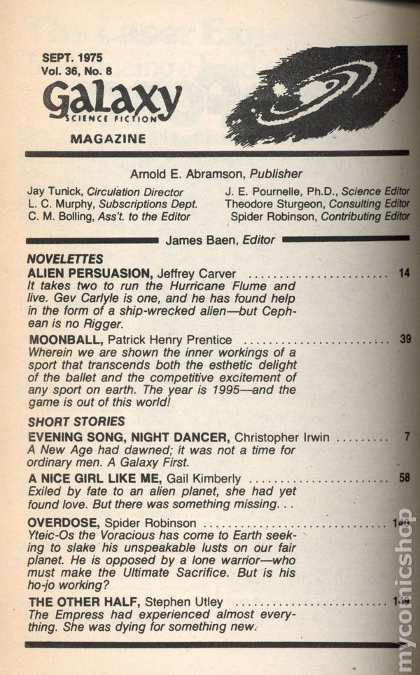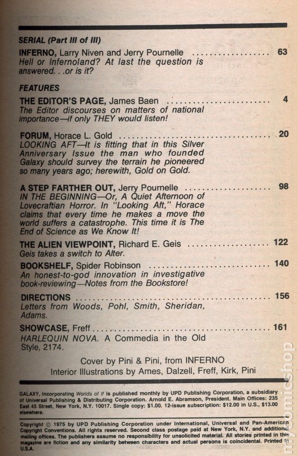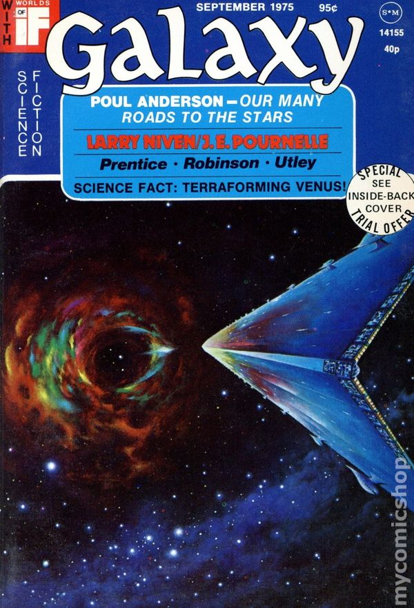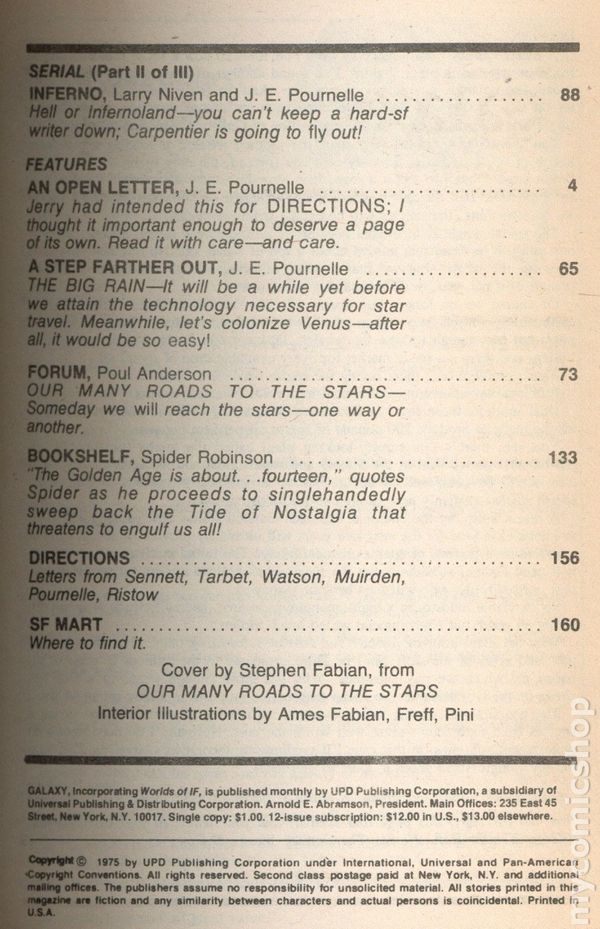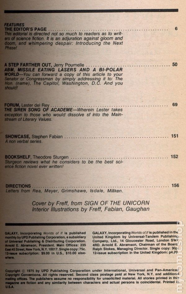 September 1975. Cover by Stephen Fabian. Science fiction stories by Jeffrey Carver, Patrick Henry Prentice, Christopher Irwin, Gail Kimberly, Spider Robinson, Stephen Utley, Larry Niven, J. E. Pournelle. Illustrations by Ames, Fabian, Freff, Pini. 5-1/8 in. x 7-5/8 in.; black and white; 160 newsprint pages. Cover price $0.95.