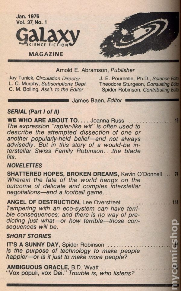 Cover by Rick Sternbach. Science fiction stories by Joanna Russ, Kevin O'Donnell, Lee Overstreet, Spider Robinson, B. D. Wyatt, Steven Utley. Illustrations by Stephen Fabian, Freff, Peter Bramley, Ames, Wendy Pini. 5-1/4-in. x 7-1/4-in.; b&w text with spot illustrations; 160 newsprint pages. Cover price $0.95.