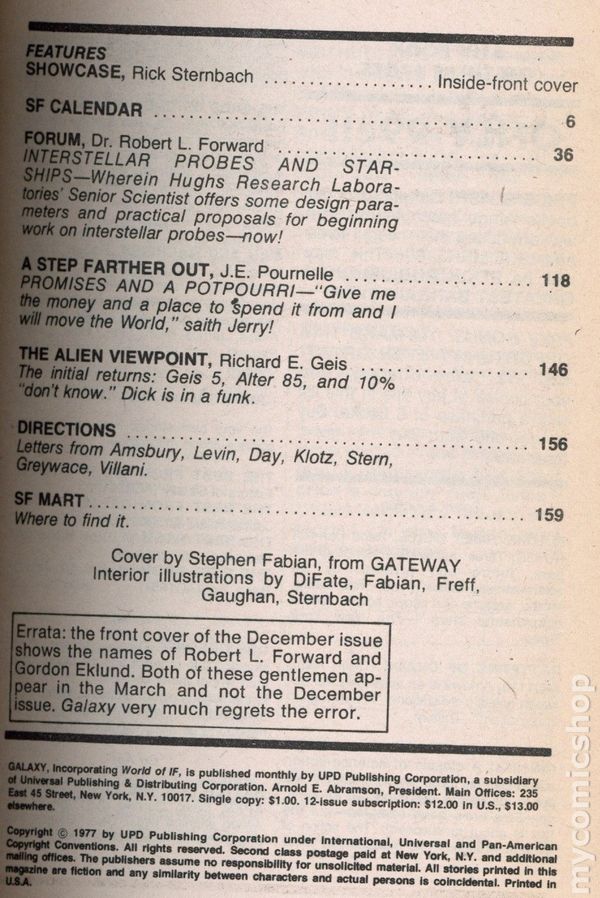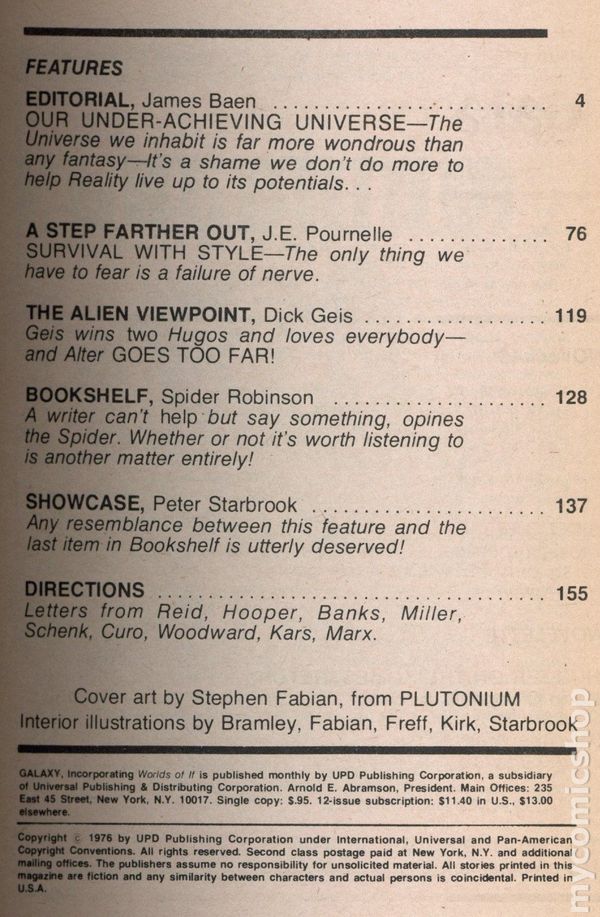 November 1976. Cover by Vincent Di Fate. Science fiction stories by Frederic Pohl, Larry Niven, Kevin O'Donnell Jr, Craig Strete, Thomas Wylde, Barry Malzberg, Bill Pronzini. Interior Illustrations by Di Fate, Fabian, Gaughan, Sternbach. Softcover Pulp Digest, 5-in x 7 1/2-in, 160 Pages, B&W. Cover price $1.00.