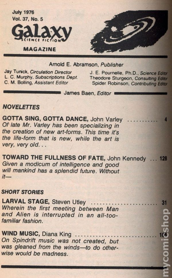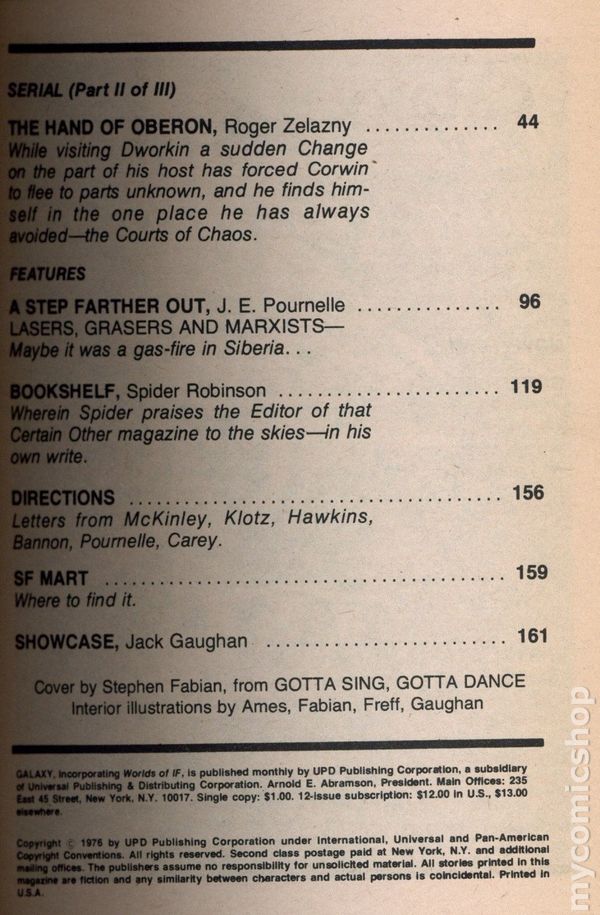 September 1976. Cover by Rick Sternbach. Science Fiction Stories: "The Children of the State" (Part 1 of 3) by Larry Niven, "The Hand of Oberon" (Part 3 of 3) by Roger Zelazny, "Abandon All Heat, Ye Who Enter Here" by Phil Bertoni, "Jupiter One" by Ernest Taves, M.D., "The Dirty Old Man" by Craig Strete, and "A Little Bit of Recycled Time" by Gail Kimberly. Interior Illustrations by Ames, Di Fate, Fabian, Freff, and Gaughan. Softcover Pulp Digest, 5-in x 7 1/2-in, 160 Pages, B&W. Cover price $1.00.
