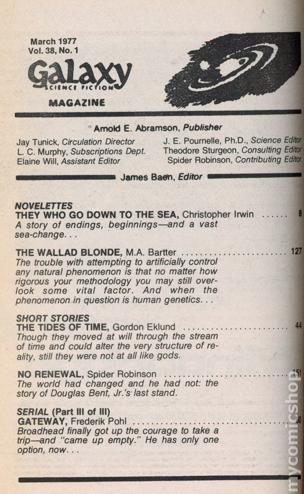 Cover by Stephen Fabian. Science fiction stories by Christopher Irwin, M. A. Bartter, Gordon Eklund, Spider Robinson, Frederik Pohl. Interior Illustrations by Rich Sternbach, Jack Gaughan, Vincent Di Fate, Stephen Fabian. Softcover Pulp Digest, 5-in x 7 1/2-in, 160 Pages, B&W. Cover price $1.00.
