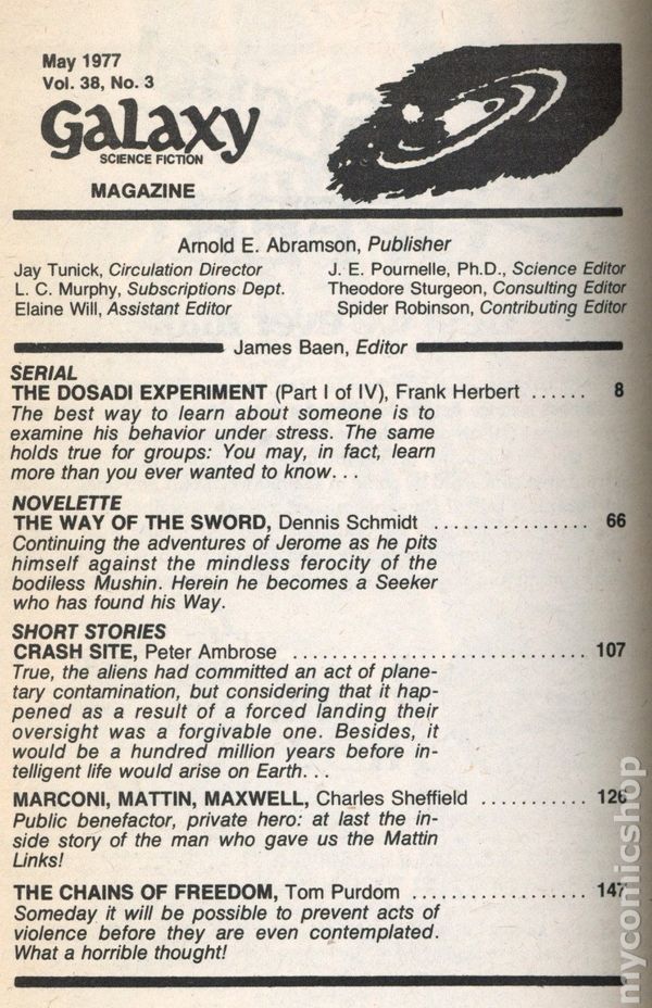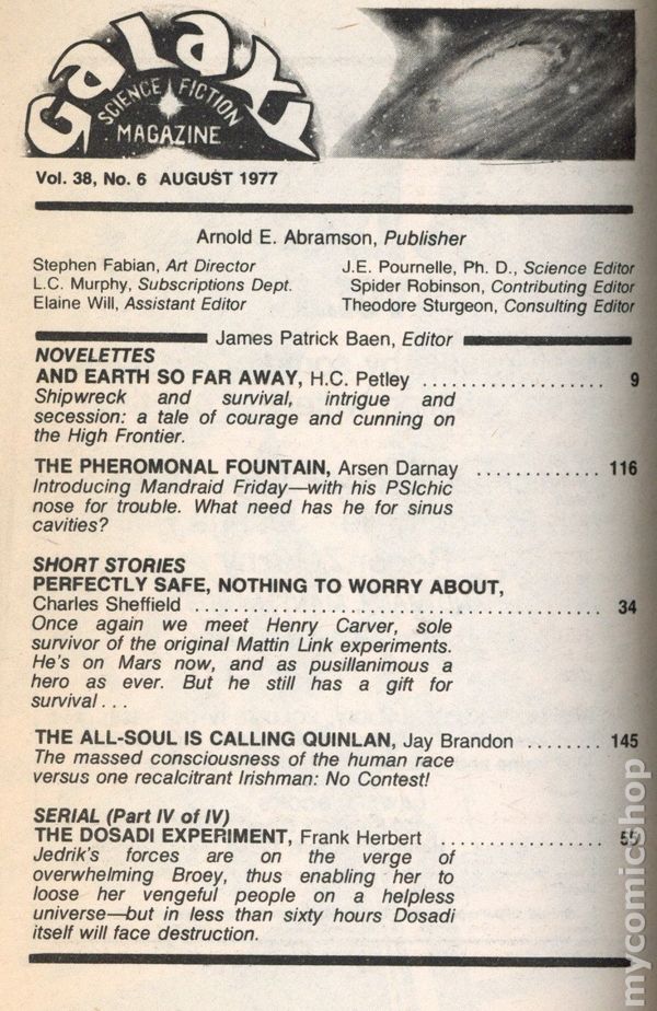 Cover by Kelly Freas. Science fiction stories by H. C. Petley, Arsen Darnay, Charles Sheffield, Jay Brandon, Frank Herbert. Illustrations by James Odbert, Stephen Fabian, P. Suedo. Softcover Pulp Digest, 5-in x 7 1/2-in, 160 Pages, B&W. Cover price $1.25.
