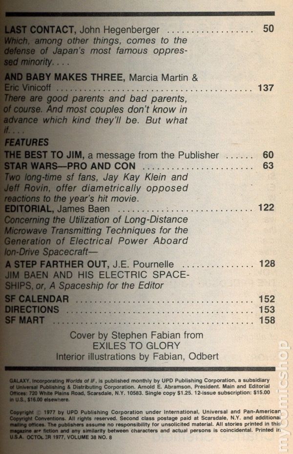 Cover by Stephen Fabian. Science fiction stories by Jerry Pournell, Tony Sarowitz, Charles Sheffield, John Hegenberger, Marcia Martin, Eric Vinicoff. Illustrations by Fabian. Softcover Pulp Digest, 5-in x 7 1/2-in, 160 Pages, B&W. Cover price $1.25.